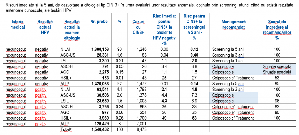 a. Urmărirea riscurilor imediate (și în următorii 5 ani), de apariție a citologiei tip CIN 3+, în cazul unor rezultate anormale, obținute la un screening de rutină, atunci când nu există un istoric de testare HPV.