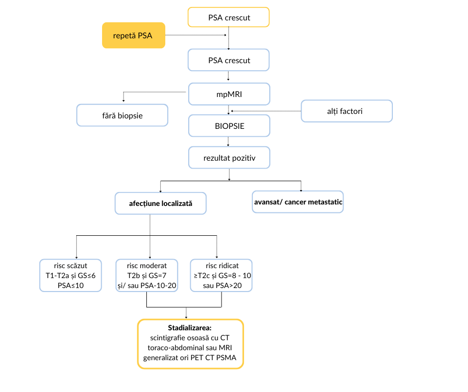 Abrevieri: CT- tomografie computerizată; DRE - examen rectal digital; GS - scor Gleason; mpMRI, imagistica prin rezonanță magnetică multiparametrică; RMN - imagistica prin rezonanță magnetică; PET, tomografie cu emisie de pozitroni; PSA-antigen specific prostatic; PSMA, antigen de membrană specific prostatei.